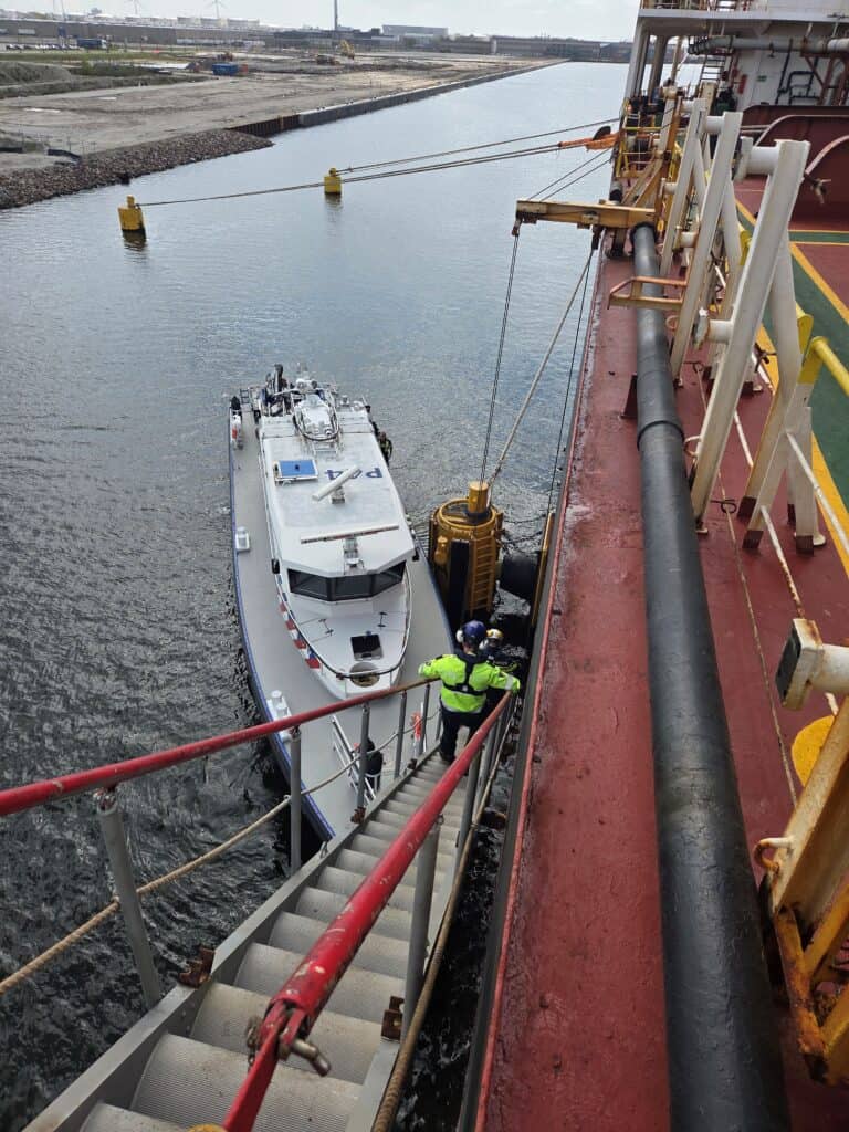 Na de waarneming werd Team Maritieme Politie (TMP) geïnformeerd. TMP stapte met ondersteuning van de collega’s van de Geografische Afdeling NoordWest in Amsterdam aan boord van het betrokken schip. Aan dek was het allemaal behoorlijk vet en olieachtig en zagen de agenten overal slangen liggen.